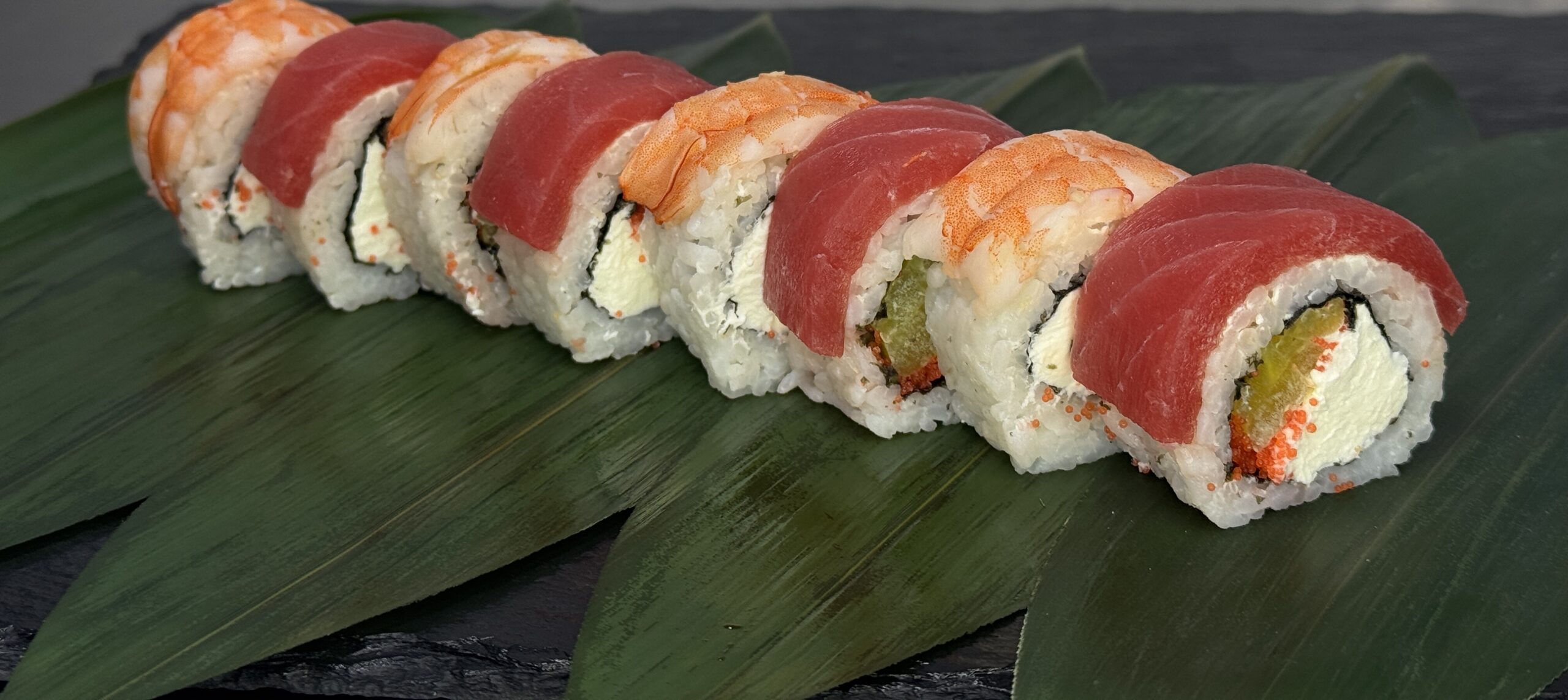 Тунец, креветки, сливочный сыр, такуан, икра тобико, рис, нори