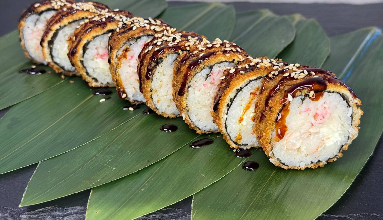 Снежный краб, креветки, сливочный сыр, рис, нори, терияки соус, кунжут