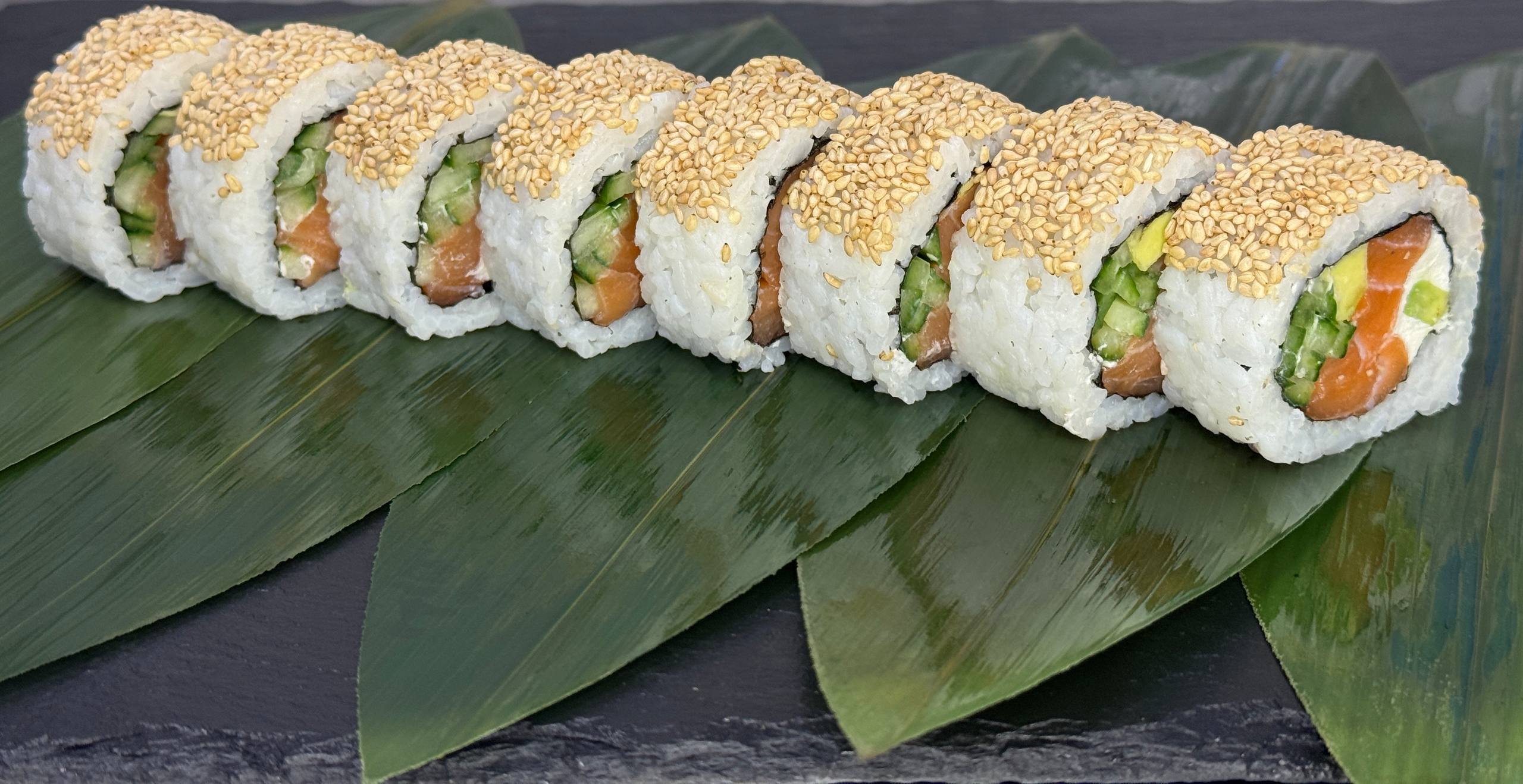 Рис, нори, лосось, сливочный сыр, авокадо, огурец, кунжут