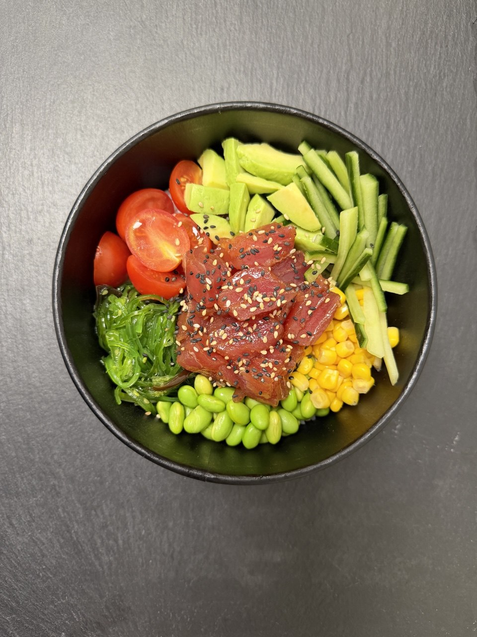 Тунец, кукуруза, огурец, чери помидоры, зеленые бобы, вакаме, авокадо, кунжут, поке соус.