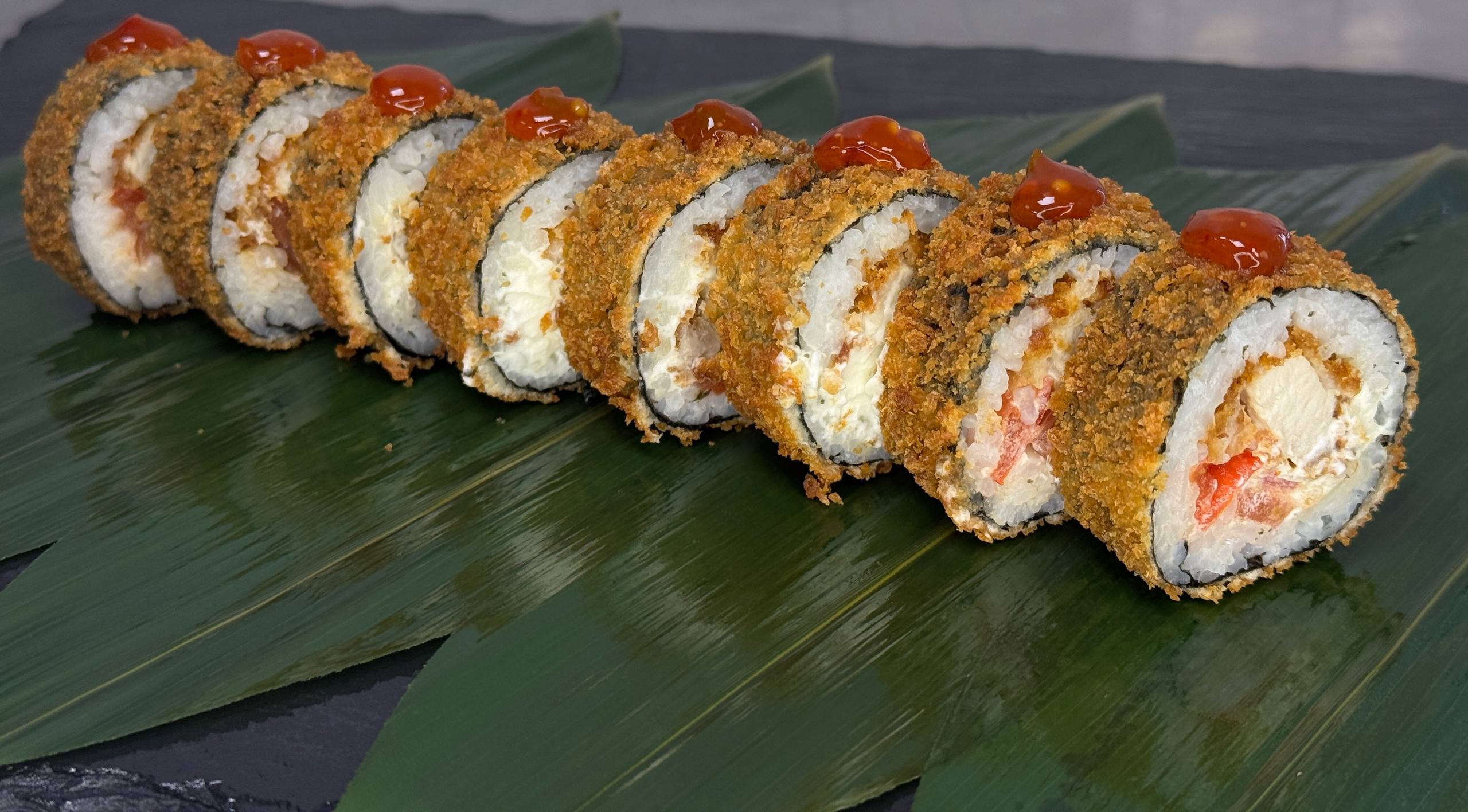 Рис, нори, курица, сливочный сыр, огурец, паприка, кисло-сладкий соус